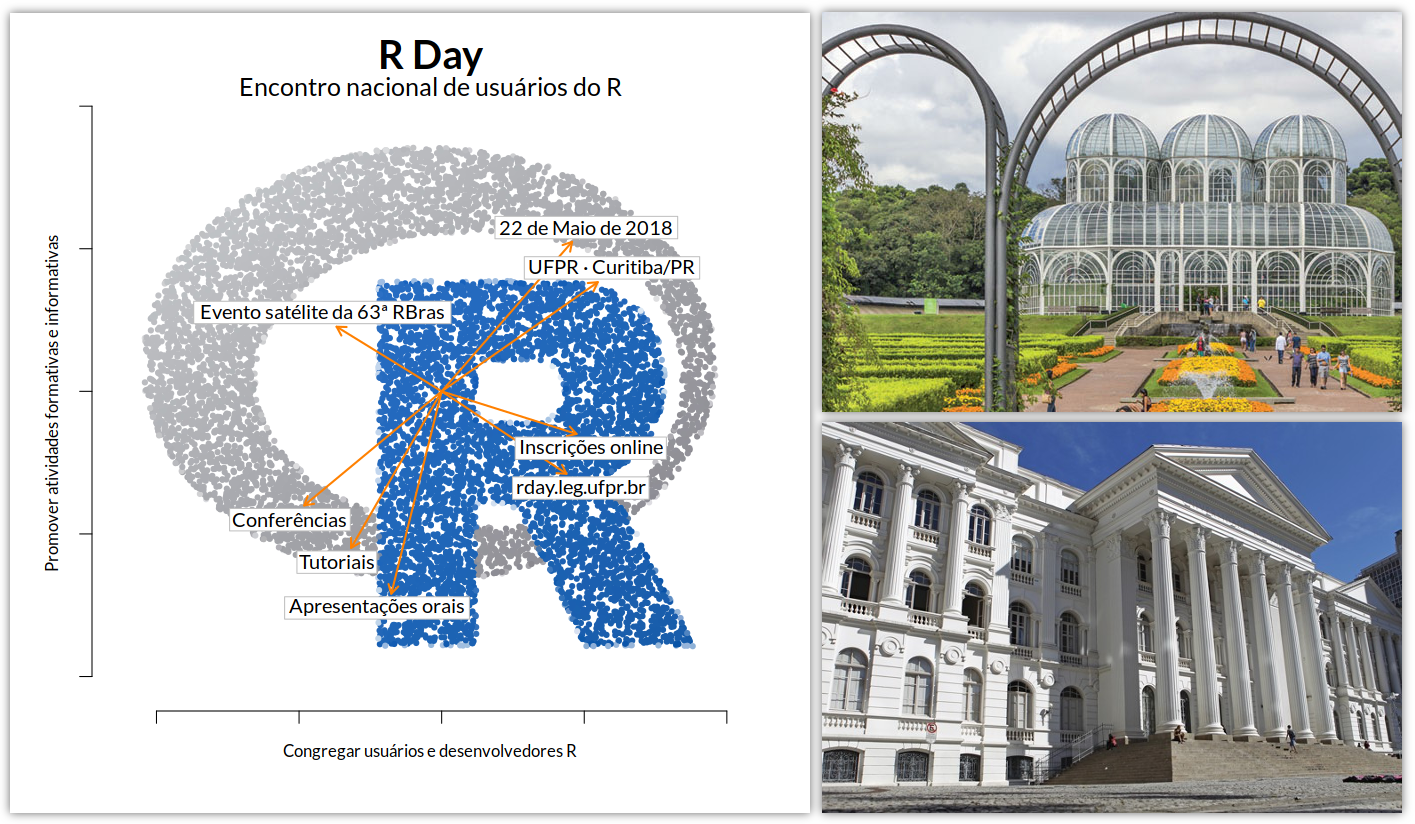 R Day logo (left), Curitiba Botanical Garden (top right), and UFPR historical building (bottom right)